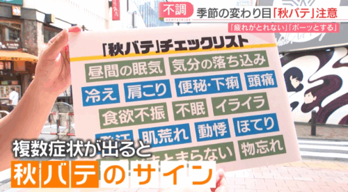 「秋バテ」についてお話しさせていただきました。秋バテの原因の一つは季節の変わり目の気温変化です。季節の変わり目は、特に体調の変化に注意が必要です。夏に冷たい冷房の中に入っていたり、睡眠不足で自律神経が乱れて、頭が痛い、睡眠不足、食欲が湧かないなど様々な症状が出る人がいます。放置しておくと仕事にも差し支えますし、免疫力が低下します。これからインフルエンザやコロナ、いろいろなウイルスが蔓延する秋から冬に向かいますので、対策をしっかり行っていただきたいと思います。秋バテを防ぐには、毎日、ストレッチや軽いジョギングなどの運動をして代謝を保つように心がけ、秋の食べ物は豊富にミネラルやタンパク質、ビタミンが入っているので、旬の食べ物をとるようにしましょう。